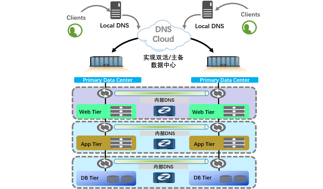 - 顺利获得内、外部DNS系统的协同,将互联网应用的域名解析引导到数据中心内部的全球负载均衡设备上,达到应用门户智能分流和自动容灾的目的,可以用户地域、用户线路、应用类型等方式分别进行容灾